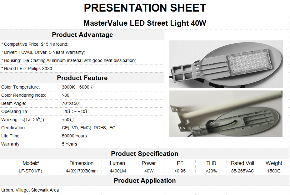 MasterValue 40W LED Street Light For Project